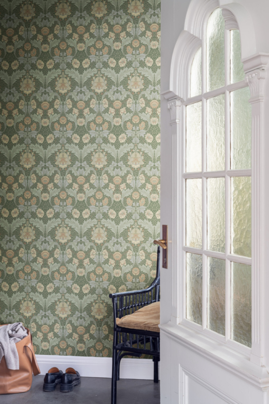 Het bloeiende ontwerp van het Myrtle behang vindt zijn oorsprong in een klassiek borduurpatroon. Hier ontmoeten de sierlijke bloemmirte en de delicate klaproos elkaar in een betoverende dans. Het patroon straalt een unieke vormentaal uit, die al van een afstand een gevoel van diepte en karakter oproept. Tegen een frisse witte achtergrond weven kleine en grote bladeren zich samen in uiteenlopende tinten groen en blauwgrijs. De bloemen, uitgevoerd in warme tinten rood en geel, worden verrijkt met subtiele details in aanvullende kleuren, wat het behang een verfijnde en harmonieuze uitstraling geeft.