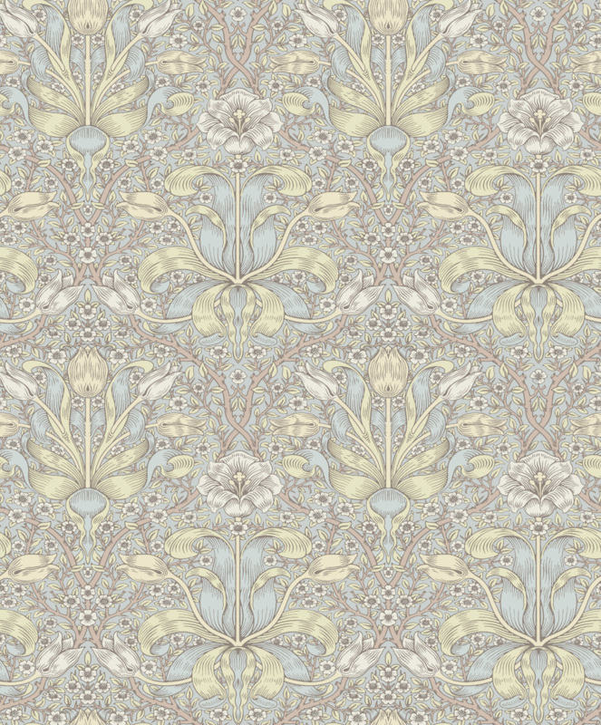 Het Spring Thicket-behang haalt de levendige energie van de lente rechtstreeks in huis. Een prachtig bosje bloeiende lentebloemen, met elegante tulpen in zachte pasteltinten zoals groen, blauw, geel en wit, ontvouwt zich tegen een achtergrond van sleedoorn takjes in warme nougat tinten. Deze zijn versierd met delicate witte bloesems en frisse groene bladeren, geplaatst op een subtiele pastelblauwe achtergrond. De vloeiende vormen van de tulpen bieden een intrigerend contrast met de scherpe lijnen van de sleedoorn takjes, waardoor het behang een boeiende diepte en speelse harmonie krijgt.
