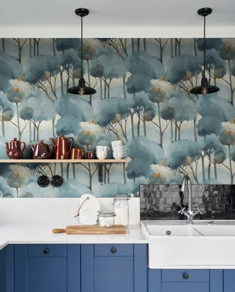 In de schaduw van de pijnbomen De aquarellen van de Landes-pijnbomen geven ze een bijna Japanse uitstraling, zacht en dromerig. Maar dat is zonder rekening te houden met de kracht van de gekozen kleuren: stormachtig blauw getint met oranje, kleigroen en een exclusieve olijf, fris en een beetje brutaal.