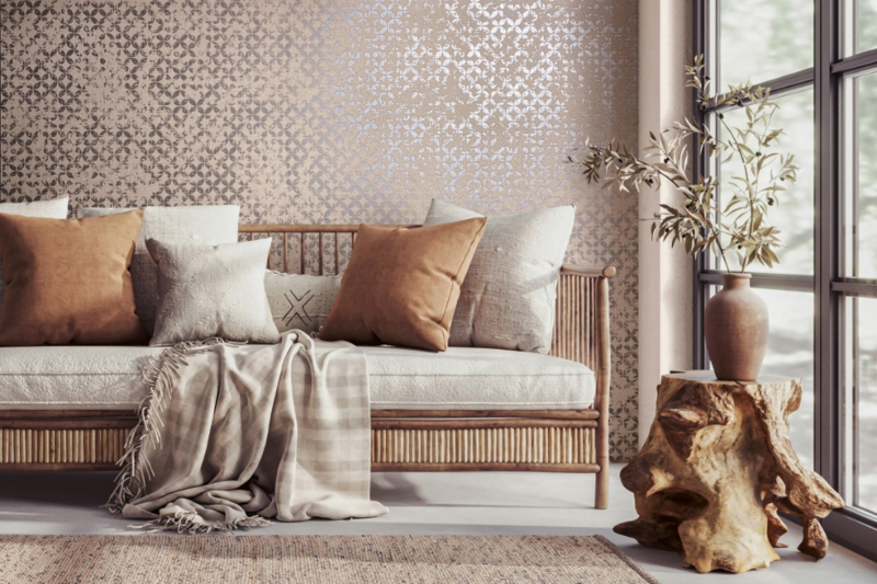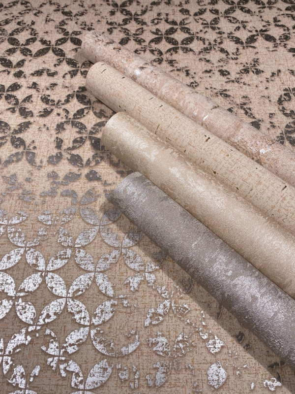 Zachte, grafische cirkels dansen subtiel over de muur en creëren een harmonieus ritme. Een perfect evenwicht tussen speelsheid en elegantie, voor een luchtige en stijlvolle sfeer.