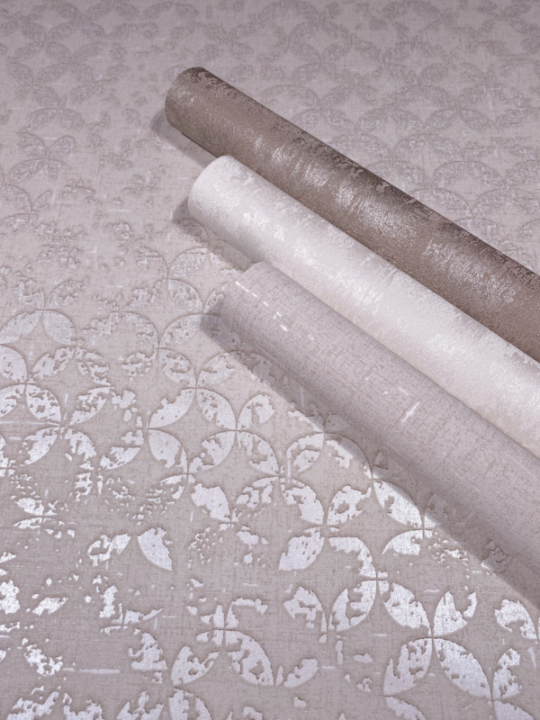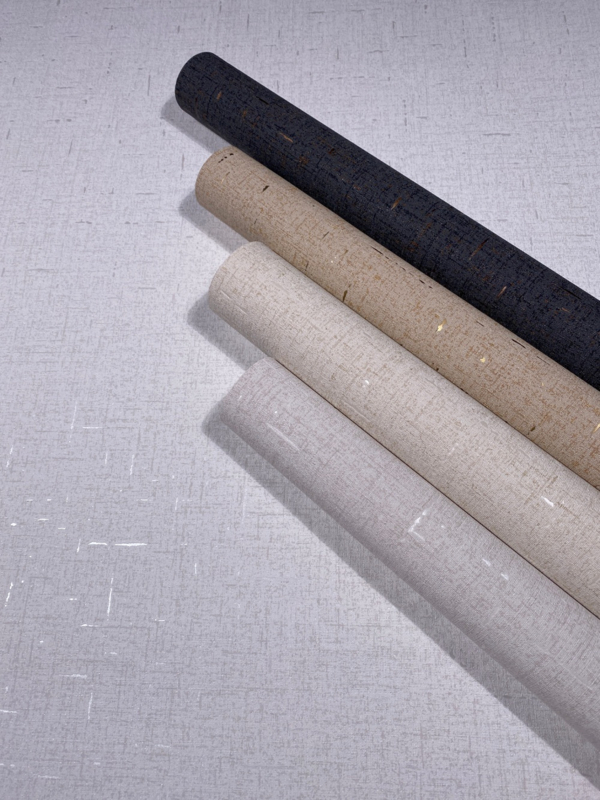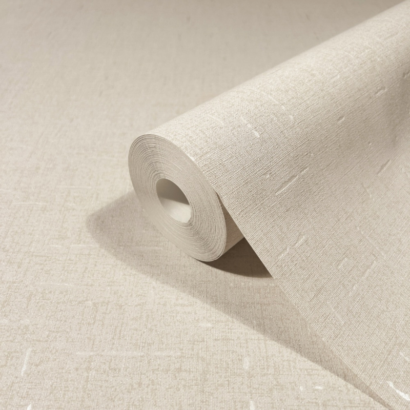 De subtiele textielstructuur in warm beige, verrijkt met een vleugje goud, straalt verfijning en luxe uit. Een tijdloze basis voor een stijlvol interieur.
