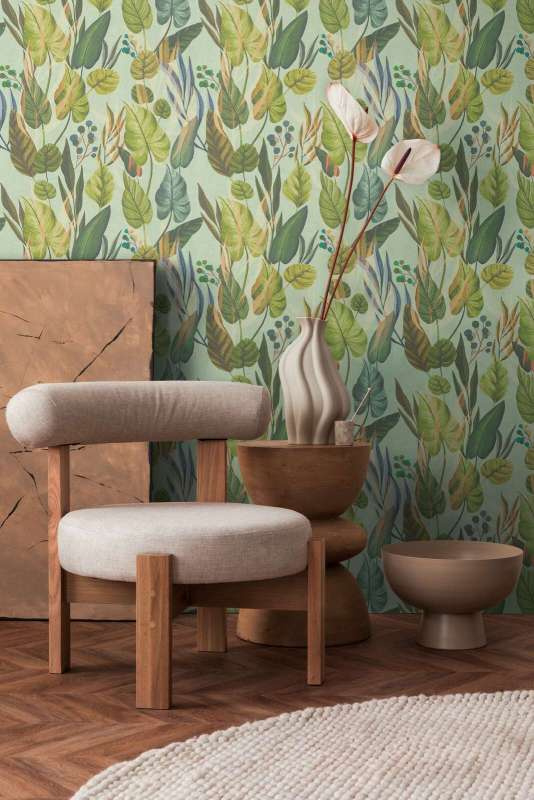 Breng een zachte, dromerige sfeer in huis met romantisch bloemenbehang. Fijne bladeren en sierlijke bloemen vormen een harmonieus patroon dat elegantie en warmte uitstraalt.