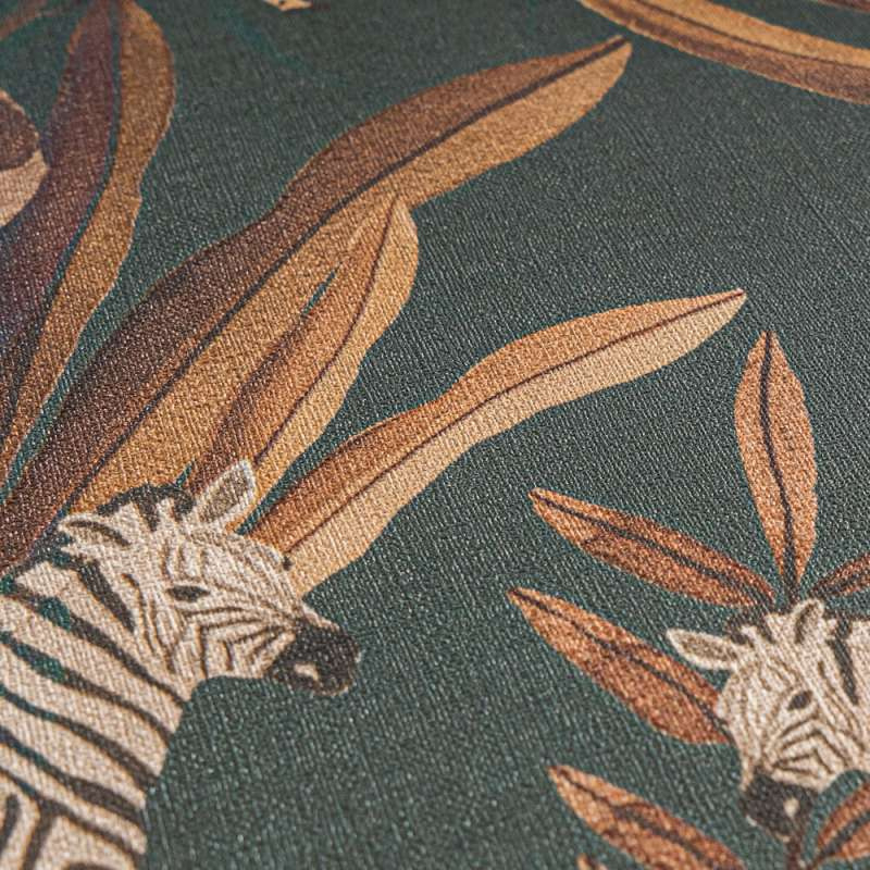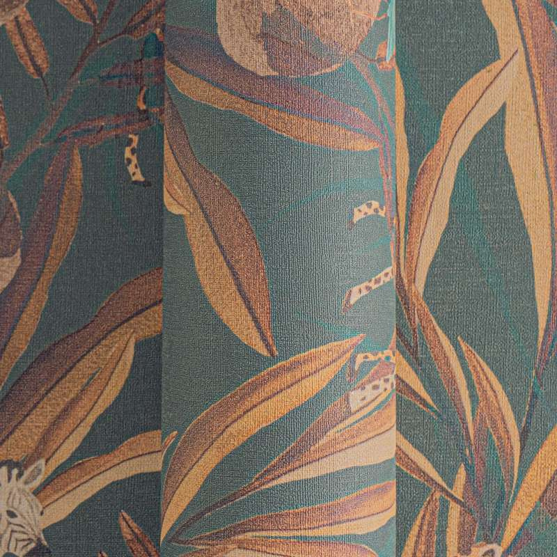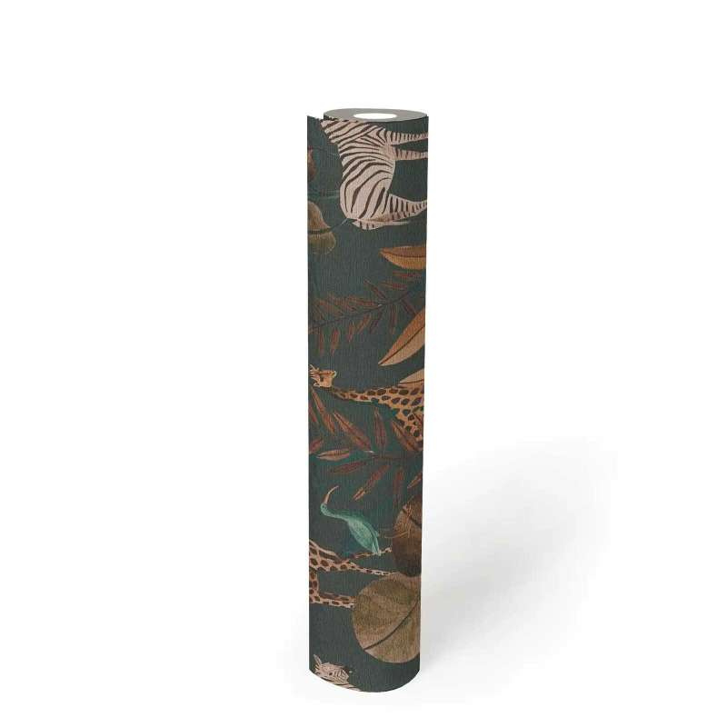 De zwart-witte strepen van de zebra’s spelen op een subtiele manier met de bladeren, terwijl de panters met hun elegante, mysterieuze aanwezigheid het tafereel een stoere charme geven. De vogels fladderen vrolijk door het bladerdak, hun kleuren brengen een speelse energie in de ruimte. Dit behang creëert een levendige, bijna magische sfeer, perfect voor wie houdt van avontuur, natuur en een vleugje exotisme in zijn interieur.