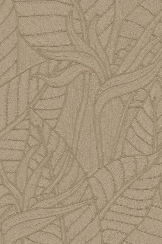 Strelitzia ontleent zijn naam aan de betoverende paradijsvogelbloem. Voor dit dessin werd de bloem vereeuwigd in een nauwgezet handwerk, waarbij haar gracieuze vormen kunstig vastgelegd werden met fijne touwtjes. Deze ambachtelijke creatie is vertaald in naar een schitterend vinyl behangpatroon dat voor een vleugje exotische luxe zorgt.