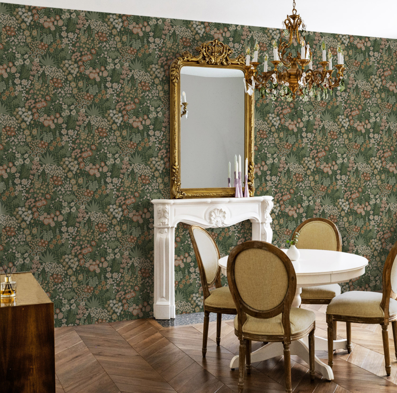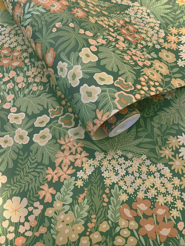 Dit behang betovert met een all-over bloemenpatroon, waarin dichte, delicate motieven samenkomen. De eenvoudige vormen in zachte kleurstellingen creëren een harmonieuze balans, perfect voor een serene en verfijnde sfeer in je ruimte.