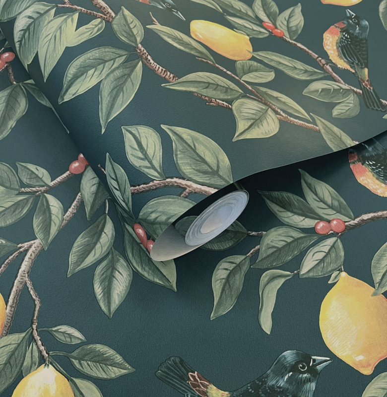 Dit prachtige behang toont een schilderachtig citroenpad, waar vogels zich nestelen op de takken omgeven door weelderig groen, sappige bessen en fonkelende gouden citroenen. Een zomerse scène vol leven, kleur en mediterrane charme die je muur tot leven brengt.