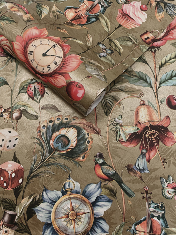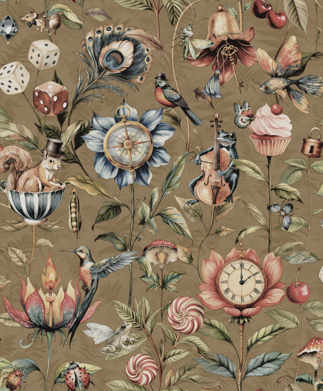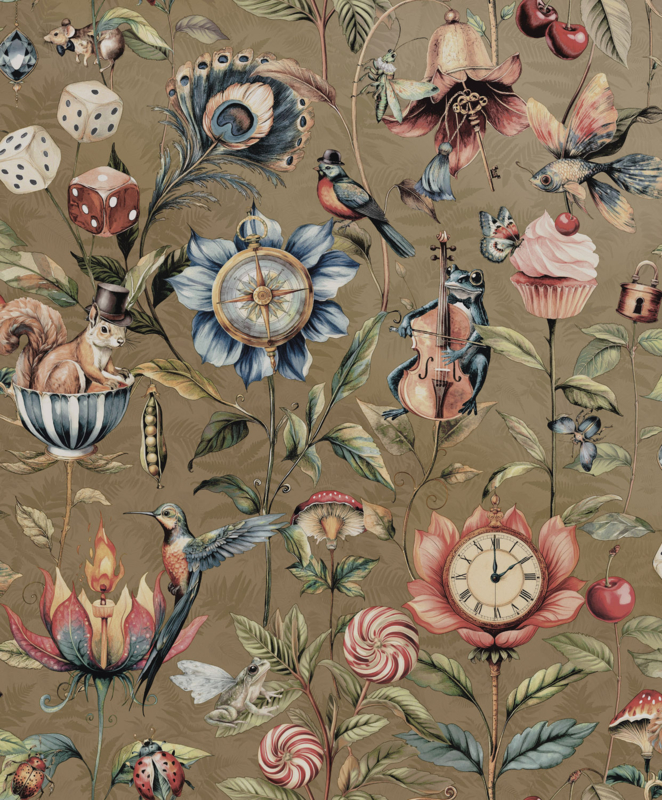 Dit behang is een feestje voor de muur – een bonte mix van dieren en wonderlijke objecten, allemaal dansend op een diepe juweelkleurige achtergrond. Een vrolijke ontdekkingstocht vol karakter, kleur en fantasie. Durf jij het avontuur aan?