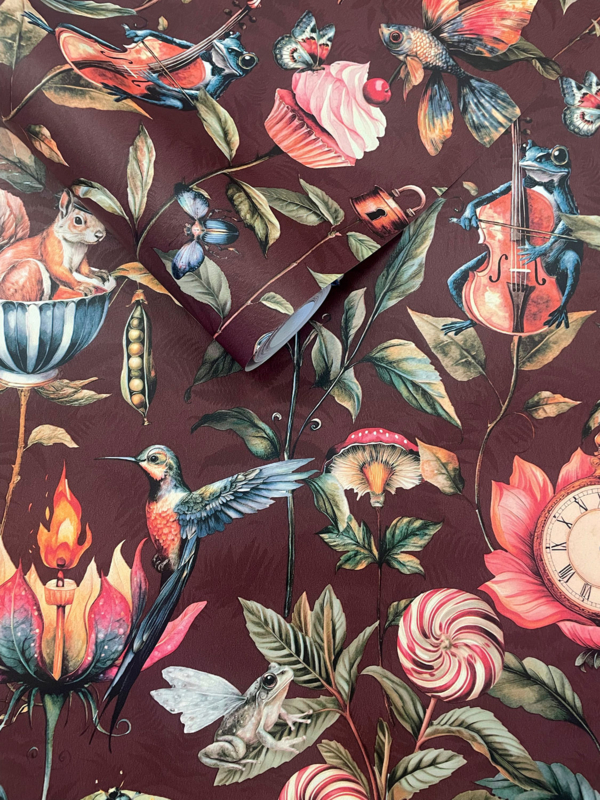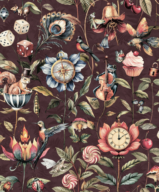 Dit behang is een feestje voor de muur – een bonte mix van dieren en wonderlijke objecten, allemaal dansend op een diepe juweelkleurige achtergrond. Een vrolijke ontdekkingstocht vol karakter, kleur en fantasie. Durf jij het avontuur aan?