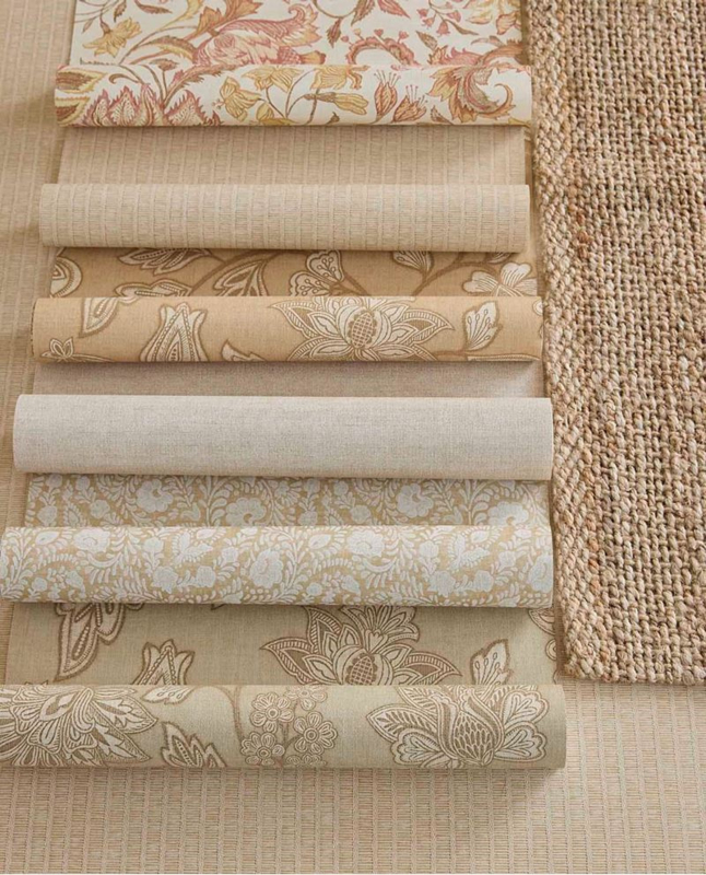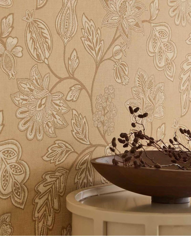 Laat je meevoeren door een sierlijk slingerend bloemenpatroon dat doet denken aan verre reizen en oude handelsroutes. De rijke print op een zachte zijdeachtige achtergrond brengt warmte, elegantie en een vleugje mystiek in je interieur.