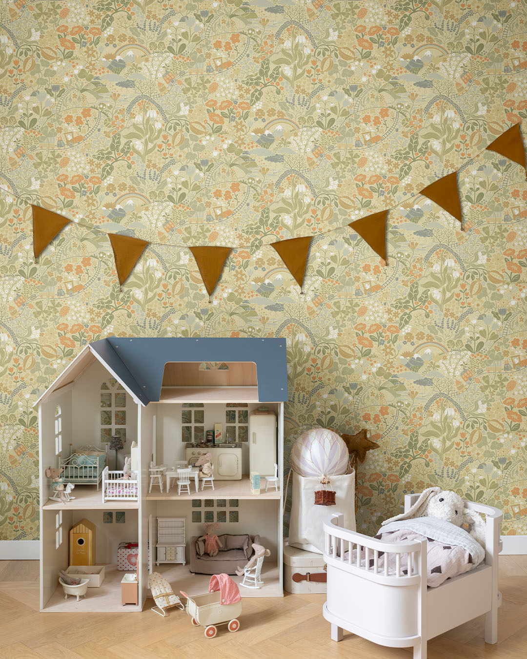 Het behang Tåget – Zweeds voor "De Trein" – neemt je mee op een betoverende reis langs een zachte, havergele achtergrond. Terwijl de trein voortglijdt, ontvouwt zich een landschap vol contrasten: de zon komt op boven besneeuwde bergtoppen, de donder rolt dreigend over zeeën, en tussen bizarre planten ontvouwt zich een sprookjesachtige wereld. In een palet van olijfgroen, grijsblauw, wit, oranje en mosterdgeel ontstaat een dromerig tafereel dat blijft verrassen. Elk detail nodigt uit tot ontdekking, alsof je steeds weer iets nieuws ziet. Stap in – het avontuur wacht op je.
