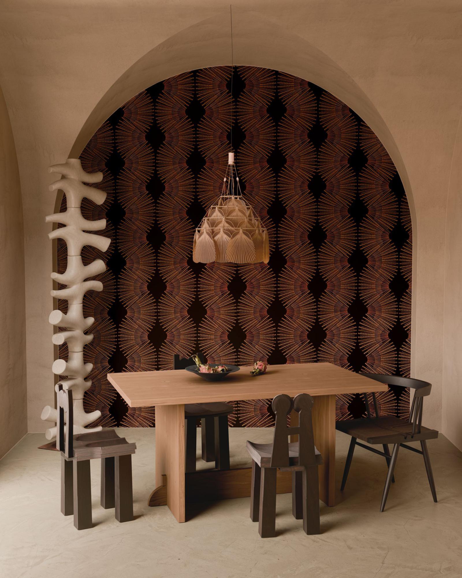Miro is een wel heel bijzondere textielmuurbekleding. Het klassieke patroon combineert fijn borduurwerk met sierlijke houten kraaltjes. Haar naam dankt dit dessin aan de miro, een lokale houtsoort waaruit veel Polynesische meubels en kunstwerken worden gemaakt. Deze geweven muurbekleding voegt niet alleen structuur en diepte toe, maar brengt ook een gevoel van exclusiviteit en verfijning in het interieur.