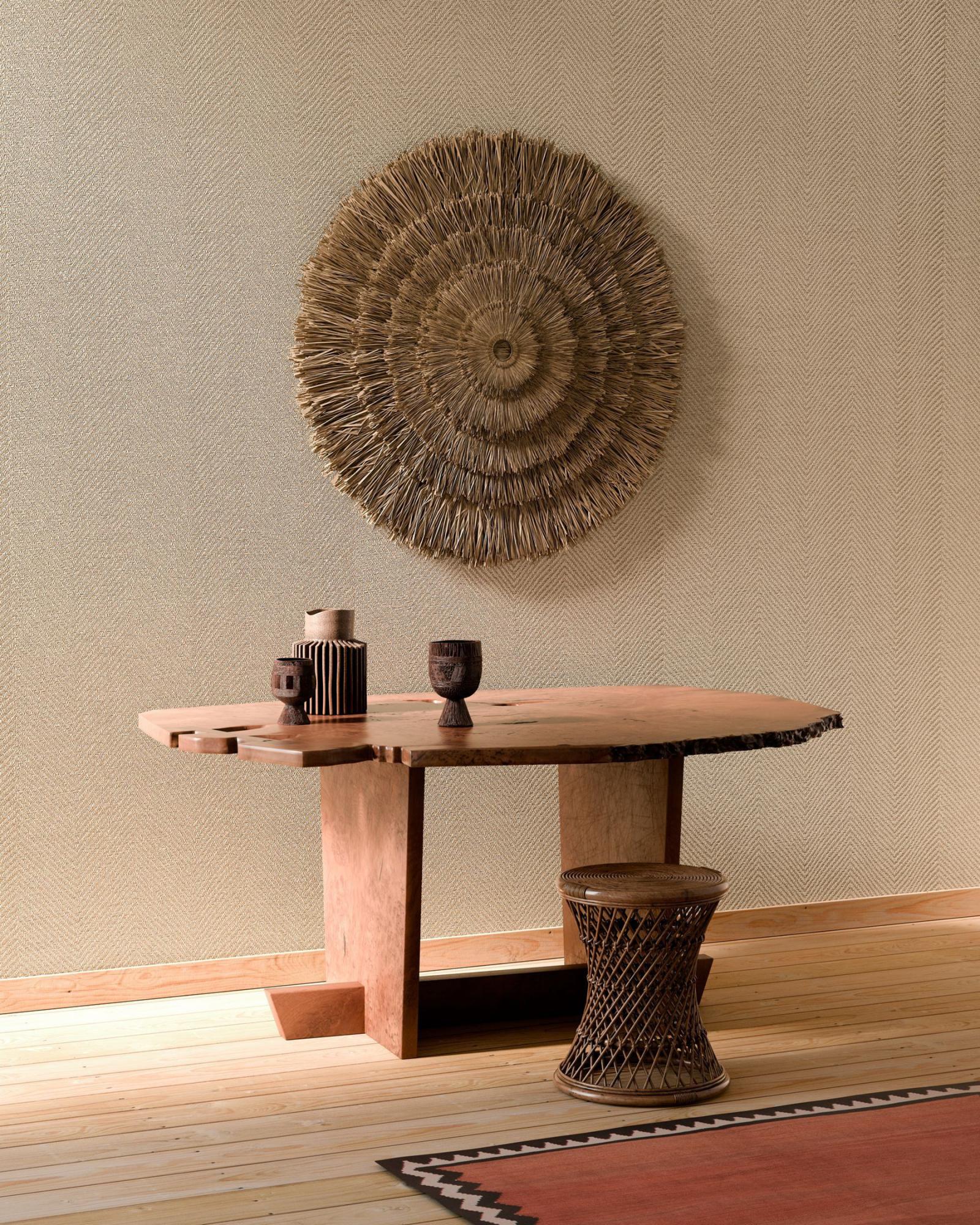 Het elegante chevronpatroon van Atuona combineert de natuurlijke charme van papier en jute in een verfijnde weving met een bohemien tintje. Dit dessin is vernoemd naar het historische dorp Atuona, waar de beroemde schilder Paul Gauguin en zanger Jacques Brel hun laatste rustplaats vonden. Beide kunstenaars werden tijdens een reis verliefd op de eilanden en gingen er nooit meer weg.