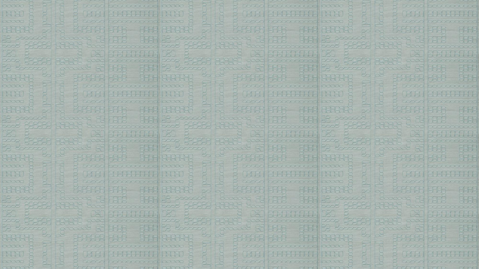 Zorgvuldig geborduurd patroon op fijn sisalweefsel, met een subtiel glanzende ondergrond.