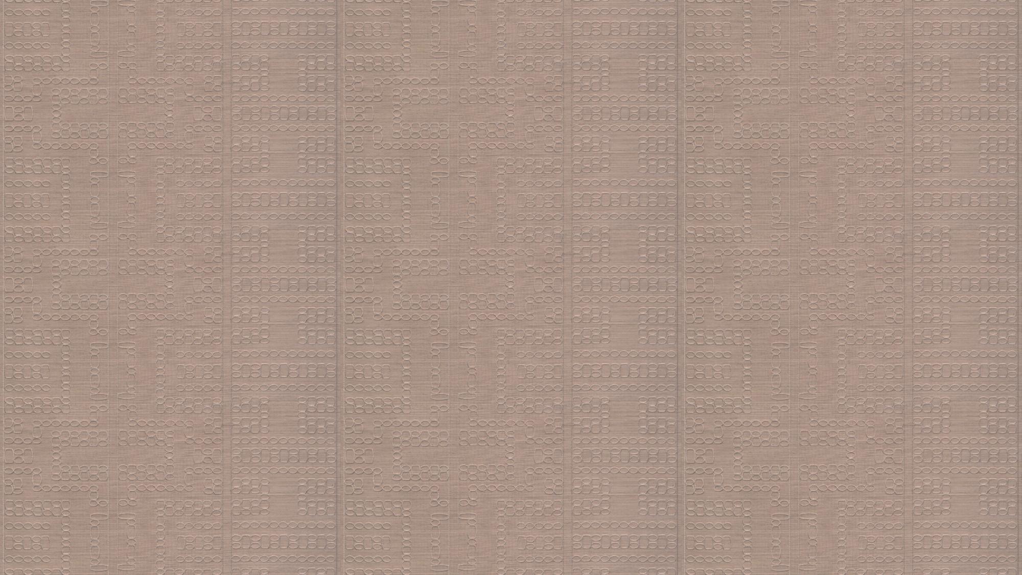 Zorgvuldig geborduurd patroon op fijn sisalweefsel, met een subtiel glanzende ondergrond.