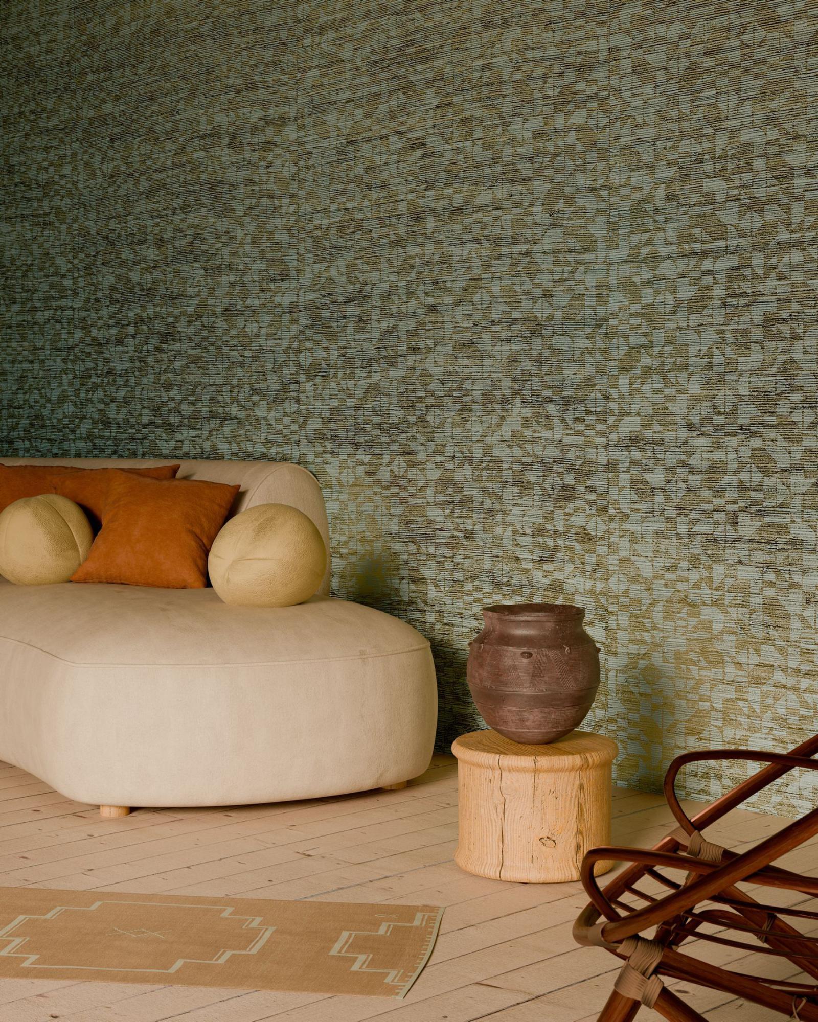 Dit dessin toont een geometrisch patroon, zorgvuldig geprint op natuurlijk gras. Een metaalkleurige folie als eindafwerking voegt extra luxe en glans toe. Het ontwerp is vernoemd naar de Cyperus marquisensis, een inheemse grassoort van de Marquesaseilanden, die deze creatie een exotisch en verfijnd karakter geeft.