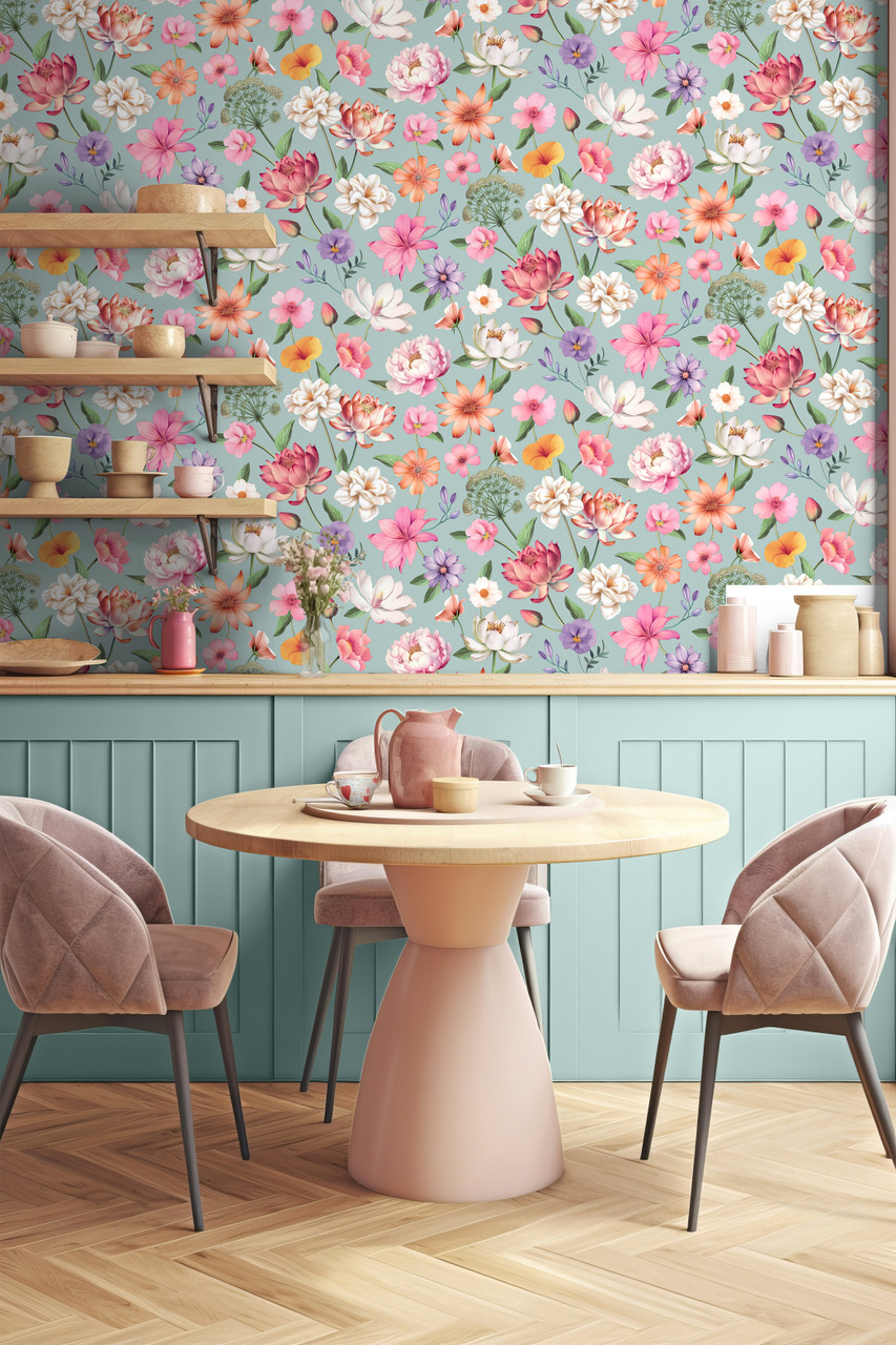 Met dit behang haal je het gevoel van een zomerse bloementuin naar binnen. Vrolijke, kleurrijke bloemen springen van de muur en brengen direct leven, licht en positiviteit in je interieur.